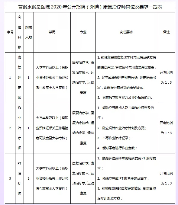 為進(jìn)一步推動(dòng)首鋼水鋼總醫(yī)院康復(fù)醫(yī)學(xué)科建設(shè),更好服務(wù)患者,因業(yè)務(wù)發(fā)展需要,決定面向社會(huì)公開(kāi)招聘康復(fù)工作人員5名,現(xiàn)將招聘事項(xiàng)公告如下: